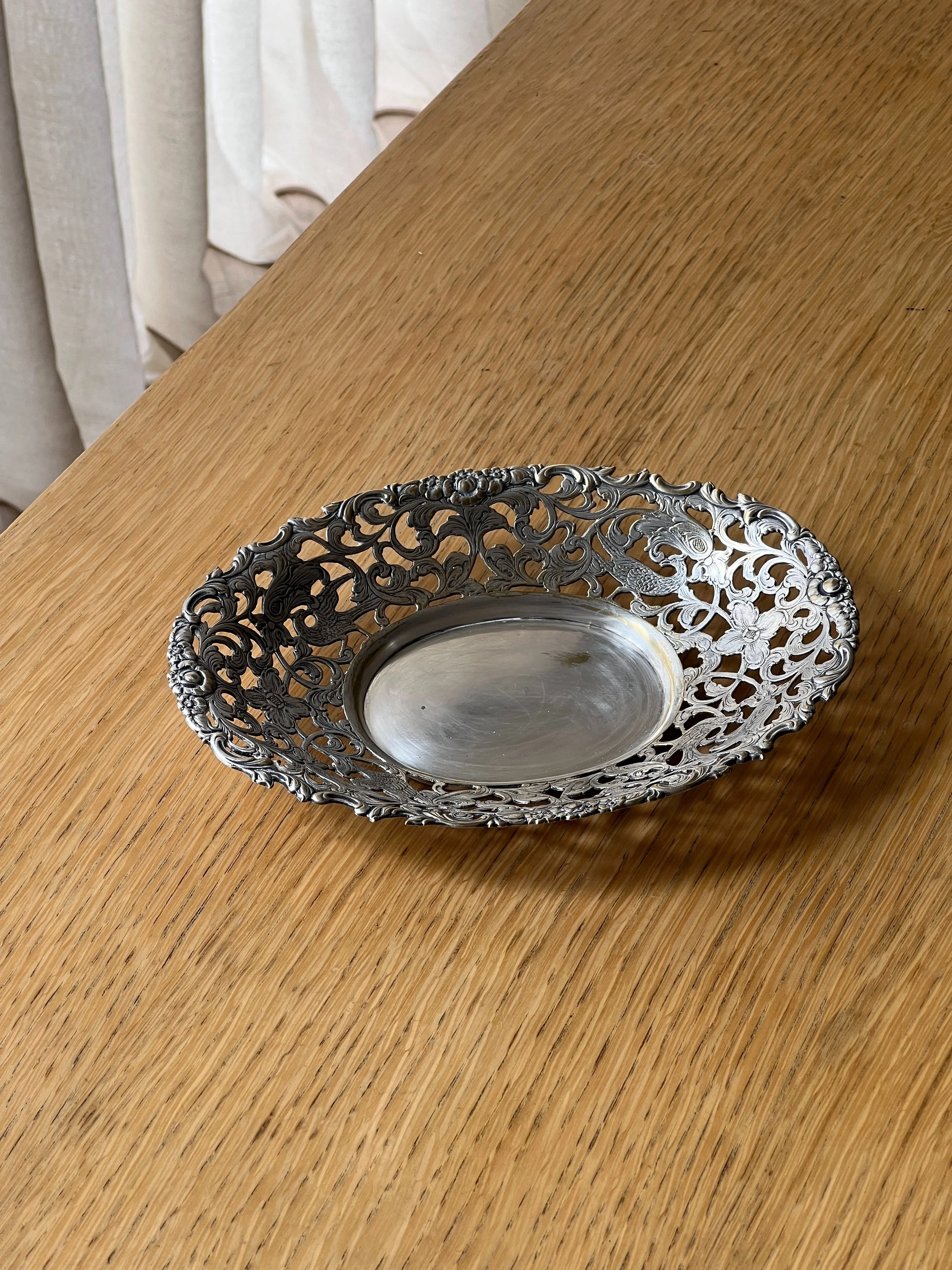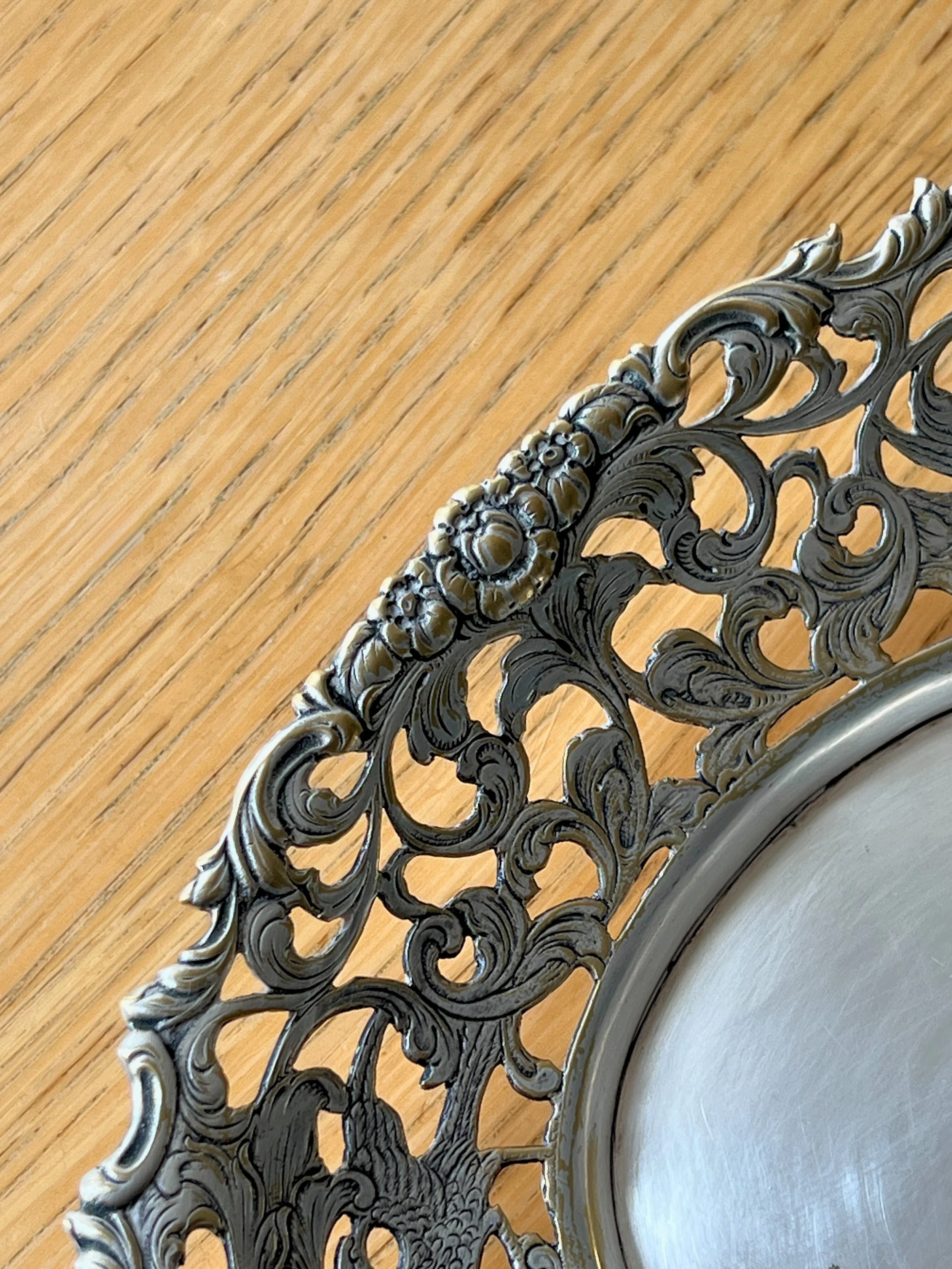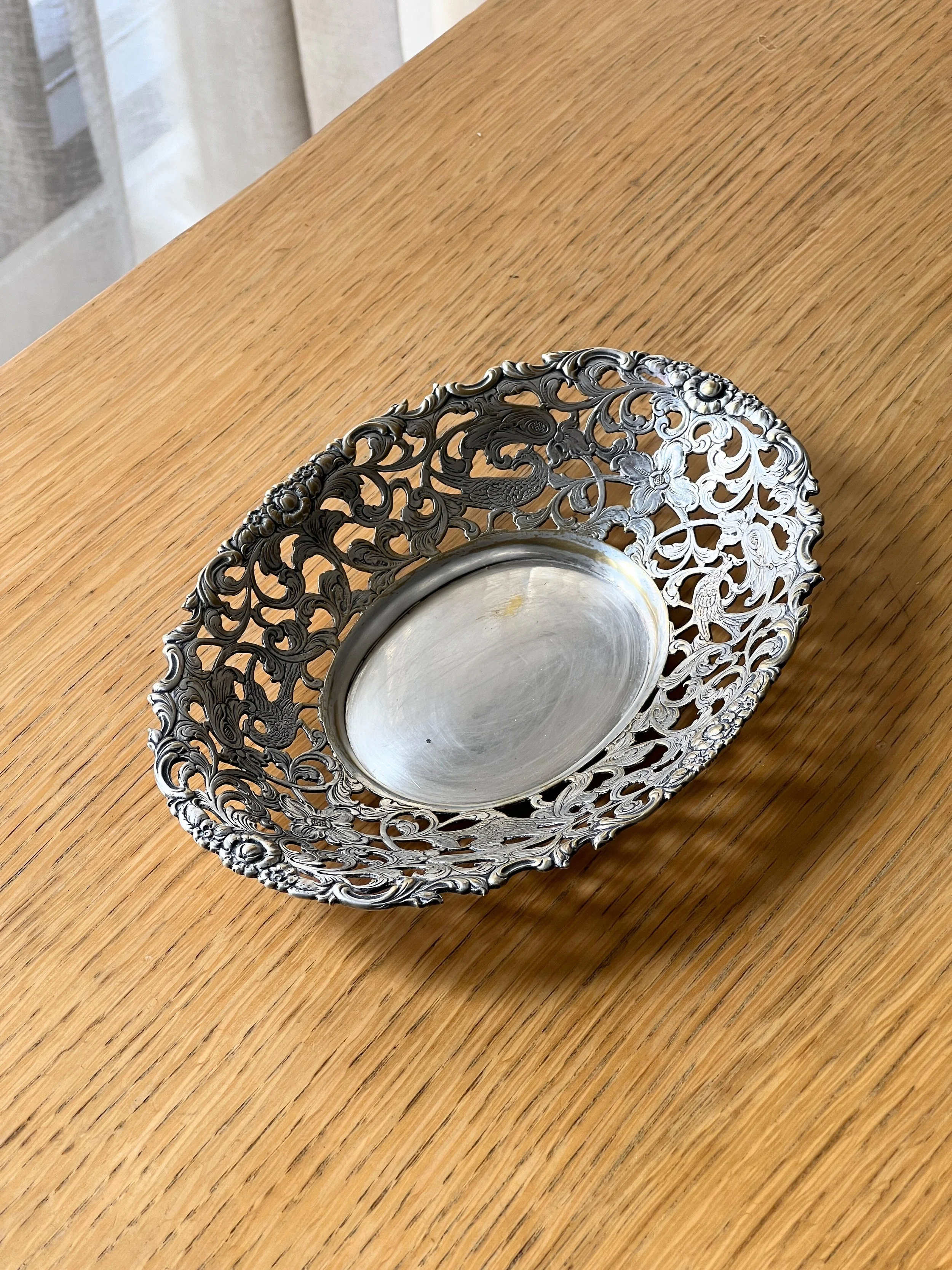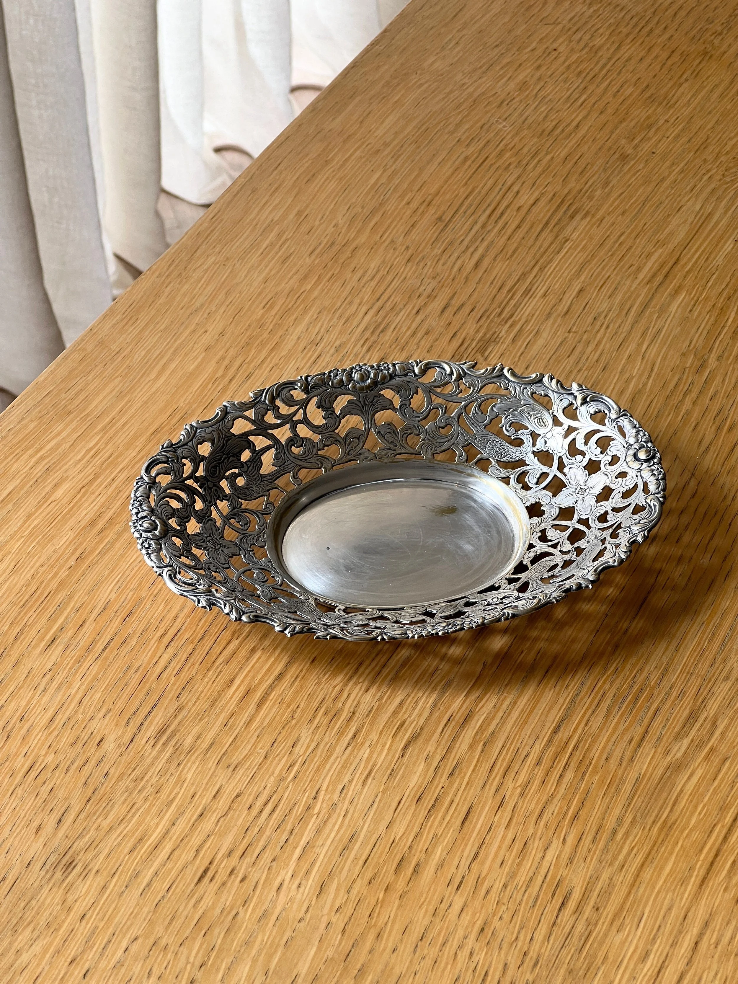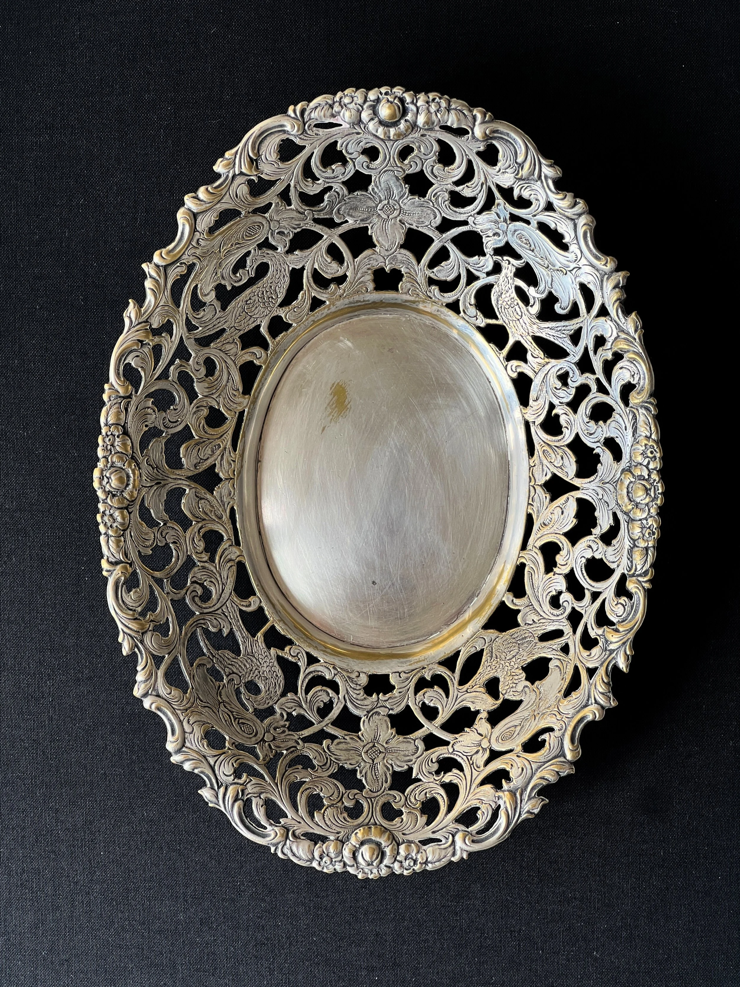 Beautifully detailed vintage silver plated bowl featuring intricate openwork with floral scrolls and elegant birds. This Rococo revival style dish has a delicate yet ornate design, perfect as a decorative table centerpiece, fruit bowl, or catchall. The craftsmanship showcases fine detailing with a romantic feel, making it a timeless accent for both classic and eclectic interiors.