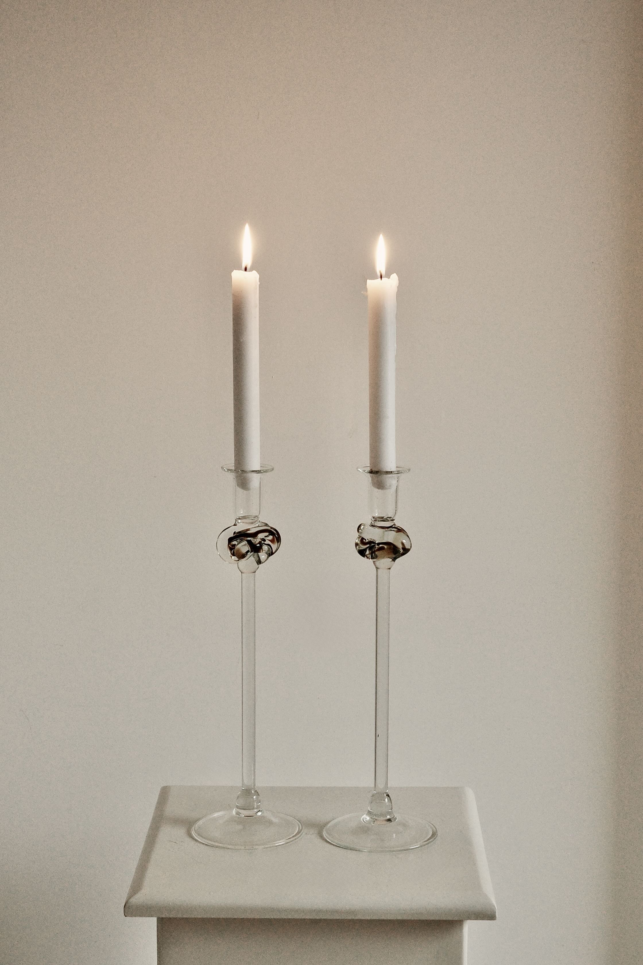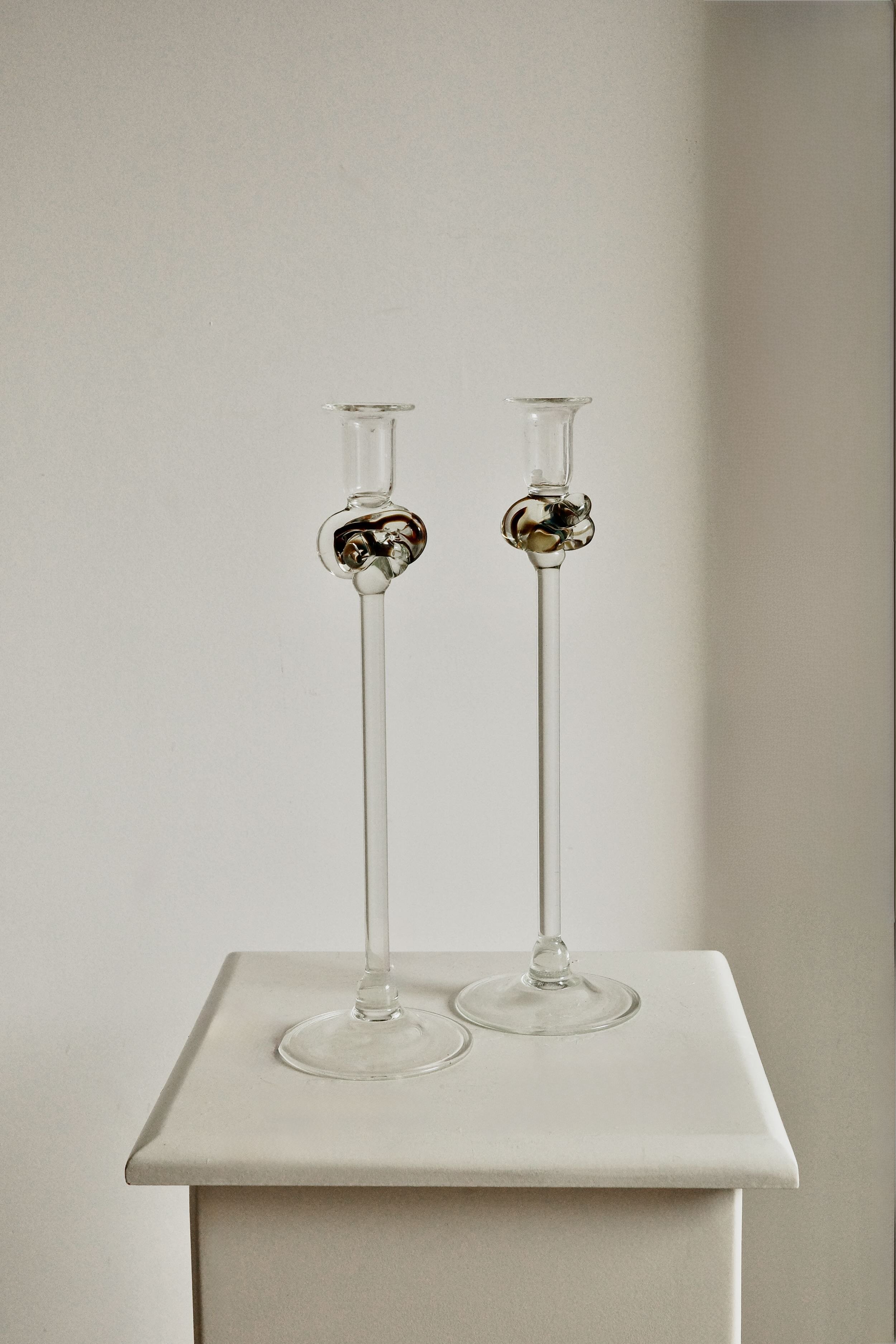 Set of four heavy glass candle holders with an architectural arched base and a textured "ice" finish. Designed and produced in Finland by Juhava. Clean, Brutalist silhouette with a solid, weighted feel. Excellent vintage condition.